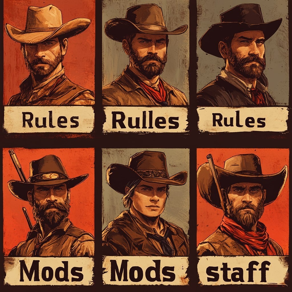 Создано на основе запроса: Four profile banners, one saying "Rules", one saying "Mods", one saying "staff", western style, 1899, red dead
