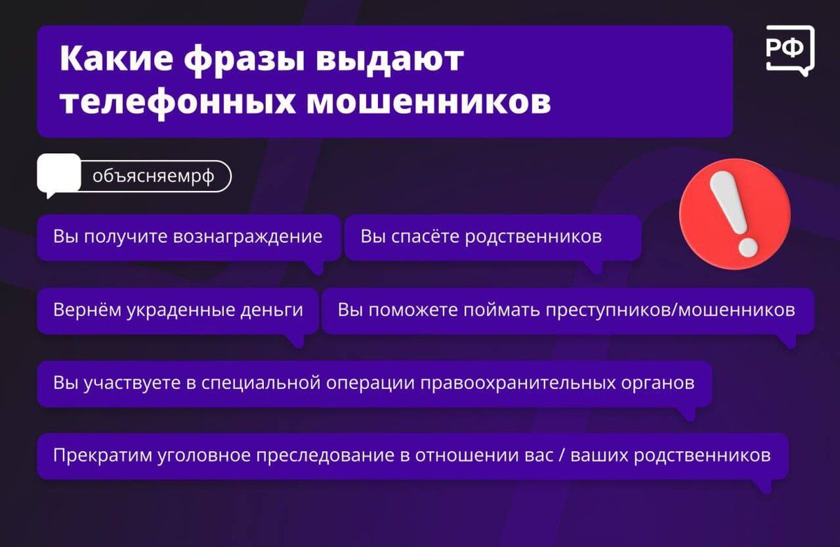 «Вы спасете своих родственников», «Вернем украденные деньги» ‼️Эти фразы используют аферисты для обмана и кражи ваших персональных данных! 📞Полиция Кубани напоминает: если вы услышали эти слова, немедленно кладите трубку - это мошенники! #НетМошенникам #безопасность Источник: Полиция Кубани (https://t.me/mvd_23)