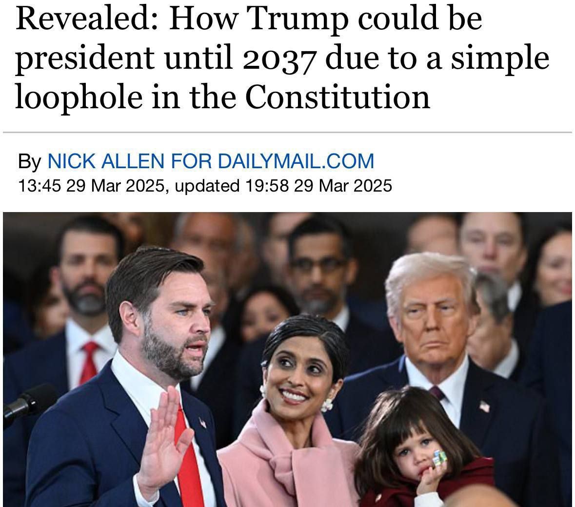 🇺🇸The Daily Mail: Трамп может остаться президентом до 2037 года, если использует одну из лазеек в Конституции США. Трамп мог бы баллотироваться на пост вице-президента, а Вэнс на президента. После приведения к присяге Вэнс может уйти в отставку, позволив своему вице-президенту Трампу занять его пост.