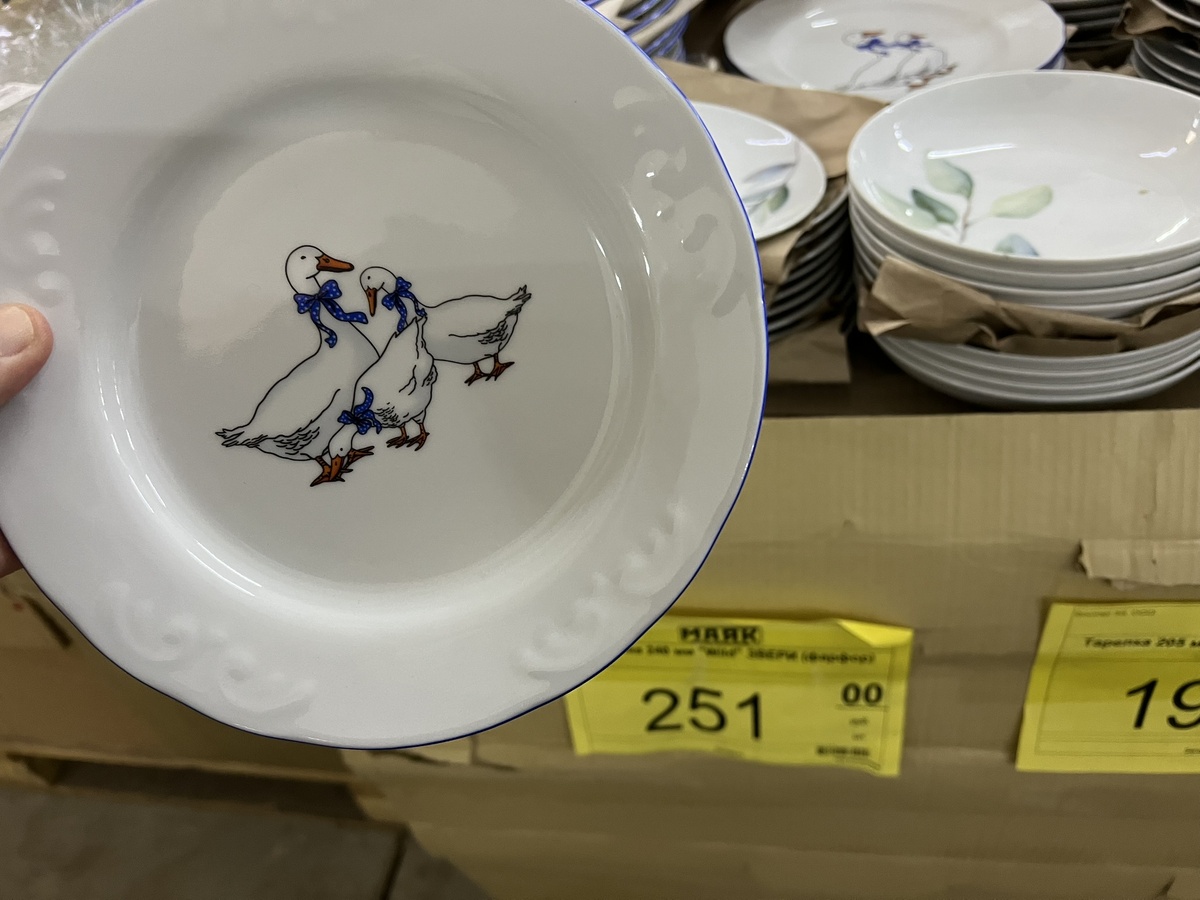 Кто не знает, сети "Маяк" и "Светофор" - одного поля ягодки. Братья, можно сказать. Старший "Маяк" - побольше, с ассортиментом побогаче. Меньшой - "Светофор" - поскромнее, и площадями, и выбором товаров. Зато и ценник- ниже. Но вообще это магазины одного владельца - группы компаний «Торгсервис». Поэтому и политика у них похожая, и товары, чаще всего, не особенно отличаются. Ну, а поскольку у меня под боком именно "Маяк" мне туда заглядывать сподручнее, чем ехать специально в "Светофор". И вот на днях я довольно удачно в наш "Маяк" заглянула! Особенно мне понравилась в этот привоз посуда. Покажу в этом обзоре исключительно ее и пару позиций, которые сама взяла из бытовой химии и продуктов. Итак, погнали! Во-первых, гуси! Тарелки - и большие, плоские, и глубокие, и миски. Гуси не сказать, чтобы новинки, я их давно уже присматриваю, но все купить не решаюсь. Хотя фарфор хороший, белоснежный! Называются они почему-то "Звери" и стоят от 194 до 251 рубля за штуку. Не сказать, что мега-деш
