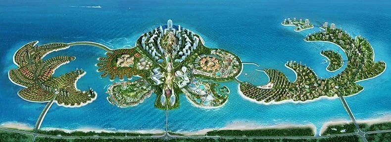 Туристический архипелаг состоит из трёх искусственных островов общей площадью 4 кв. км, объединённых между собой. На них расположены объекты для развлечения и отдыха для людей всех возрастов и интересов. Отели, в том числе категории 5 звёзд, парки и аквапарки, музеи, океанариум, магазины duty free, конференц-центр, ТЦ, кафе, бары, рестораны, достопримечательности. Острова разбиты на улицы, а все объекты подсвечены необычной современной системой, которая сама по себе может быть достопримечательностью. Реализовала проект китайская компания Evergrande Group на деньги частных инвесторов, без участия государства. При планировании островов ожидалось, что ежегодно Ocean Flower Island будут посещать не менее 10 млн туристов со всего мира.