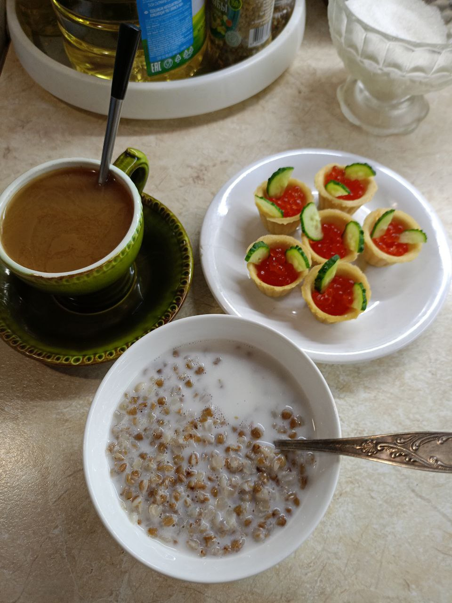 Что я ем на ПП.Гречка с немолоком. Тарталетки с икрой и огурцом.Суп с чечевицей и овощами.Компот. Картошка.Квашеная капуста.Килька.