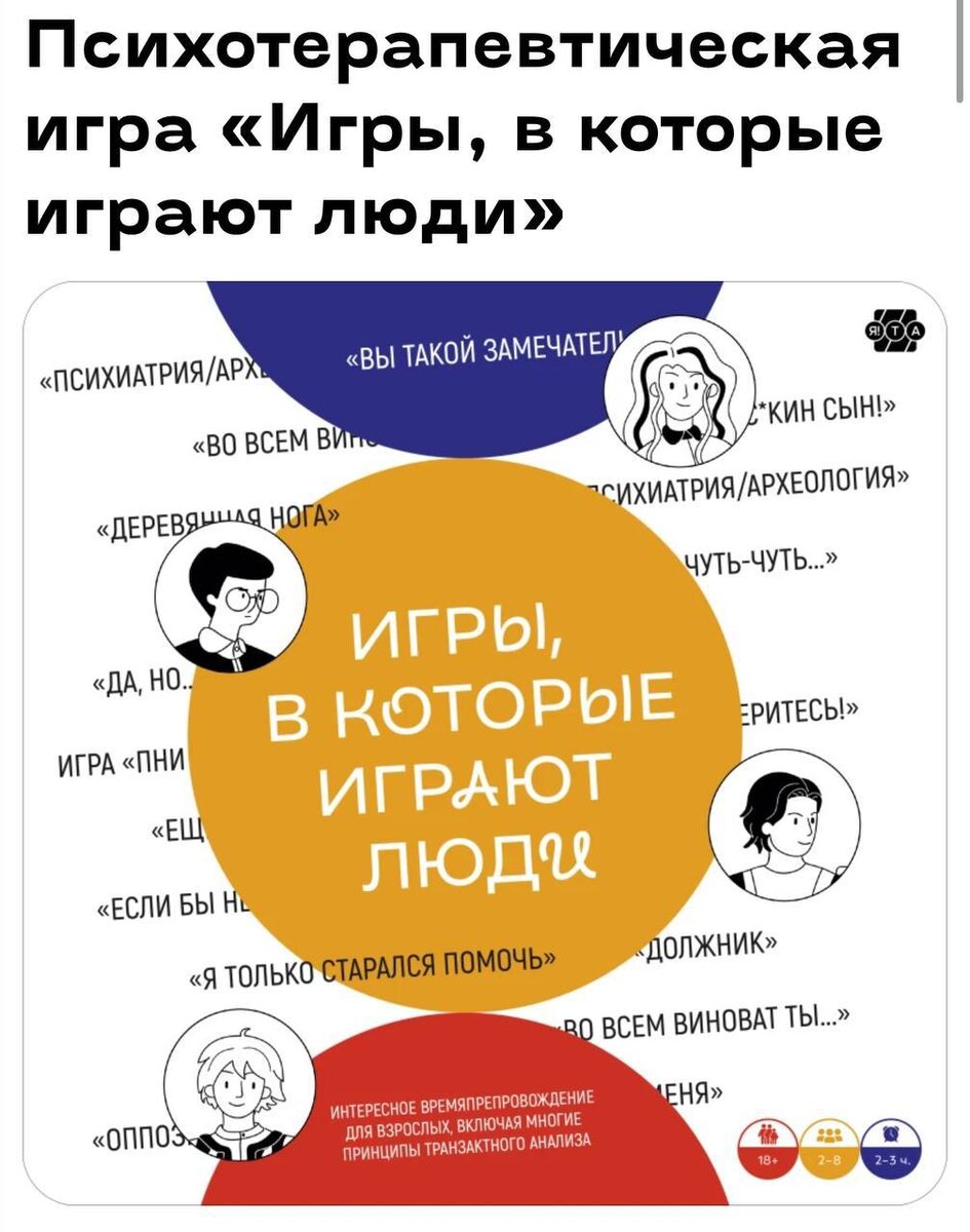 Апрель. Психотерапевтическая игра «Игры, в которые играют люди» Санкт-Петербург 19.04 12:00-15:00 (м. Чернышевская ул.Рылеева 1/9) Москва 24.04 18:30-21:30 (м. Пр.Вернадского ул Кравченко д.11) ❗️‼️‼️🔴 Приглашаю вас сыграть в терапевтическую настольную игру «Игры, в которые играют люди». Игра была создана при жизни Эрика Берна по мотивам одноименной книги и адаптирована для России специалистами клуба «Я!ТА». Игра позволит вам окунуться в мир человеческих взаимоотношений, изучить различные стратегии поведения и научиться лучше понимать себя и окружающих. Участие в игре поможет вам: ➡️начать или продолжить исследовать свой жизненный сценарий. ➡️научиться анализировать себя через призму эго-состояний. ➡️улучшить навыки коммуникации. ➡️научиться анализировать свои стратегии поведения(в отношениях, на работе, в семье и других сферах жизни) и выбирать более эффективные. ➡️познакомиться со своими любимыми психологическими играми и узнать как можно их останавливать и нужно ли. Количество