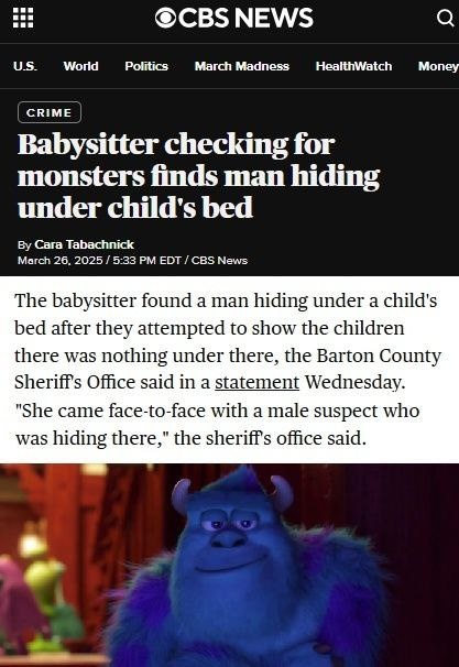 В Канзасе ребенок перед сном пожаловался няне, что у него под кроватью "монстр". Женщина, конечно же, не поверила. Но на всякий случай проверила и ужаснулась. Под кроватью прятался неизвестный им мужчина. Он надавал няне тумаков и сбежал.
