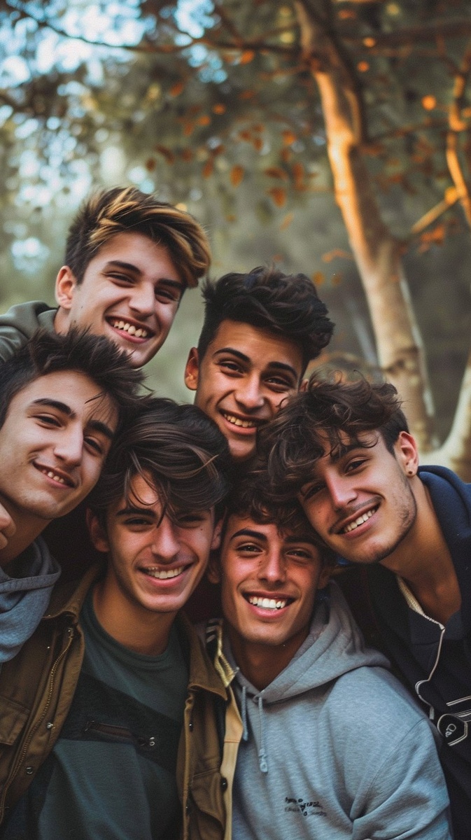Создано на основе запроса: a group of 5 young men friends facing the camera, happy, embracing each other