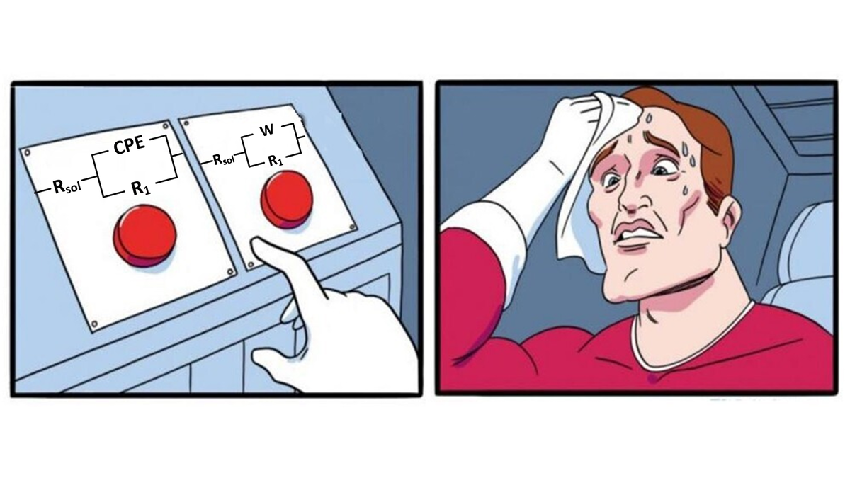 В этой статье мы не будем рассматривать теорию измерения или анализа электрохимической импедансной спектроскопии (ЭИС). Мы сконцентрируемся на том моменте, когда исследователь садится за воображаемый стол перед своей совестью и пытается интерпретировать результаты, моделируя графическую аналогию электрохимической системы, которую принято называть эквивалентной схемой. Для начала рассмотрим самый простой случай, какой может прийти в голову. У вас плоский электрод из химически инертного материала – платины, например - погружен в раствор электролита. Химическая инертность дает нам право допустить отсутствие образования пусть и тонких, но все же пористых слоев оксидных пленок. Итак, чистый металл в электролите. Годограф ЭИС будет выглядеть примерно вот так. (Рисунок 1) На границе образуется двойной электрический слой (Cdl), а в процессе установления динамического равновесия возникает сопротивления переноса заряда (Rct), которое определяет скорость электрохимического акта. Ну и, конечно, им