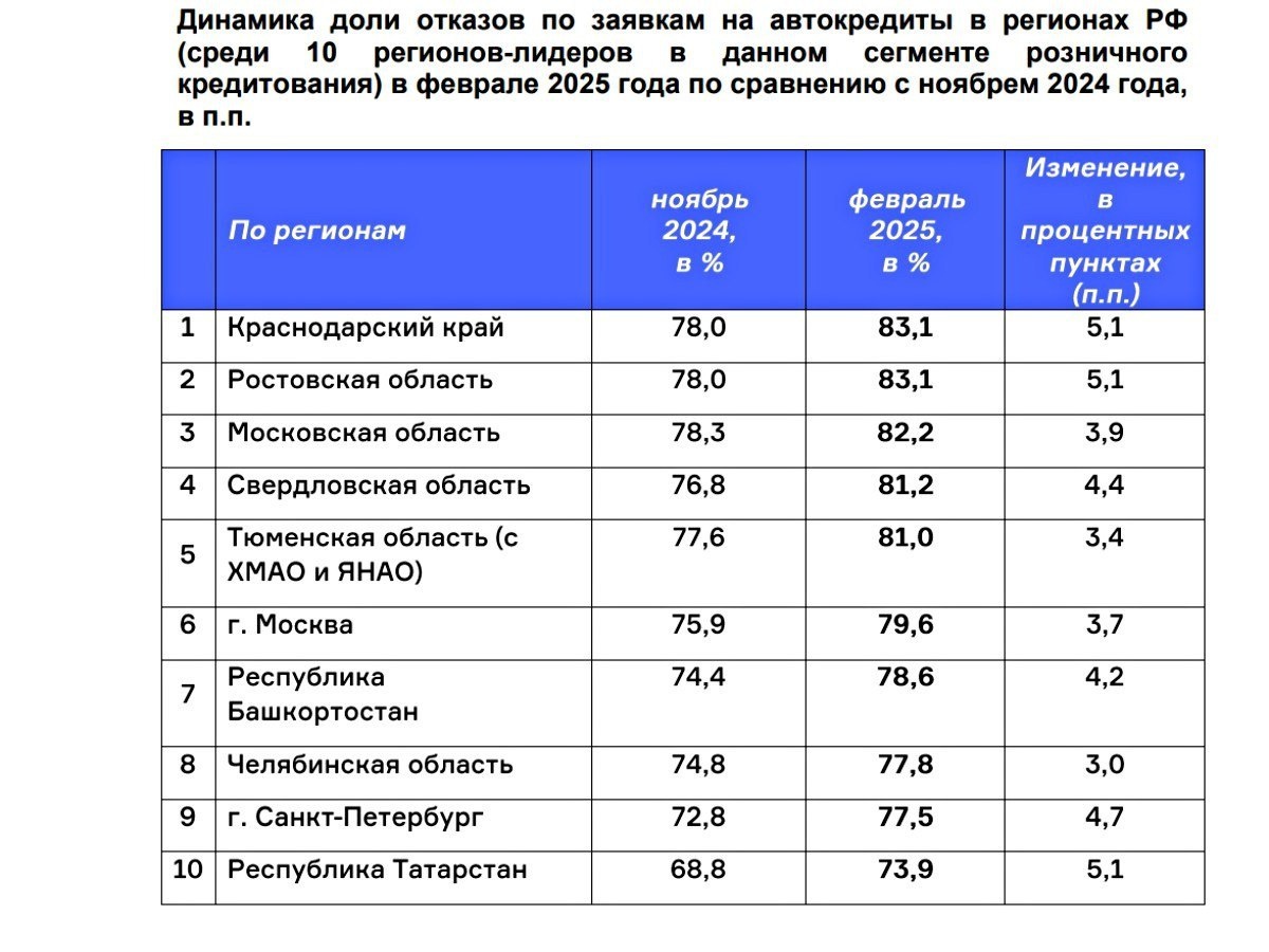 Доля отказов по автокредитам в Ростовской области достигла 83,1% В феврале 2025 года доля отказов по заявкам на автокредиты в России продолжает расти. Национальное бюро кредитных историй (НКБИ) зафиксировало увеличение показателя до 81,1%, что на 0,9 процентных пункта выше уровня января. Ростовская область входит в число регионов с максимальной долей отказов — 83,1%. Основная причина — введение ограничений для заемщиков с долговой нагрузкой свыше 50%. Новые правила фактически закрыли доступ к автокредитованию для значительной части населения.