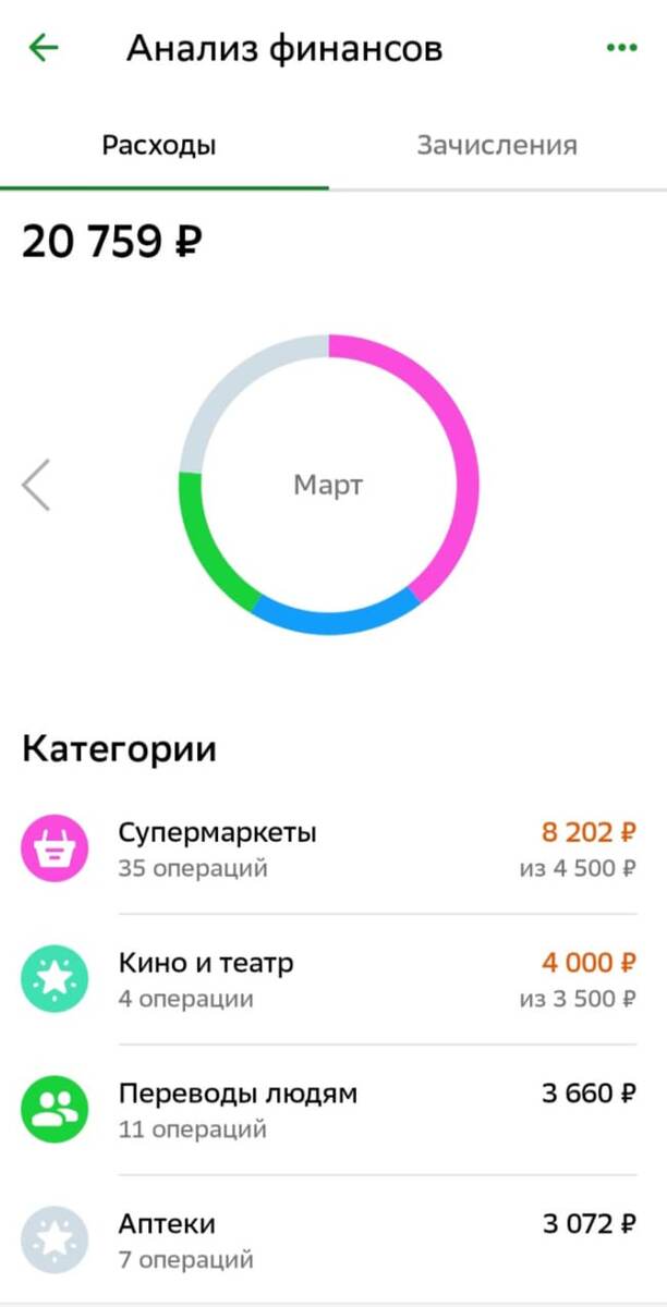 Всем привет. Сегодня последний день марта, и я подвела итоги трат на питание за месяц. А за март я потратила денег на питание дофига. 😲 Ничего особенного не покупала. Из мясных продуктов купила курицу, куриную печенку и килограмм говядины. Из половины говядины сварила суп, и все его с удовольствием ели. В морозилке лежат замороженные кальмары и четыреста граммов филе палтуса. В тетрадь траты на питание не записывала. В начале месяца несколько дней записывала, а потом решила не переводить понапрасну бумагу. Все подсчеты есть в Сбербанке онлайн. Там все учтено по категориям, и зачем мне дублировать эти подсчеты? 30 марта вечером посмотрела, сколько всего потратила, а не только на питание. Получилось, что потратила все, что получила, и даже чуть больше. На питание сумма увеличилась в два раза - расслабилась. Сумма на кино и театры на двоих, а моя - две тысячи. Покупаю онлайн два билета на себя и подругу, а она мне деньги наличкой отдаёт. Про аптеку всё понятно. Всё, что ку