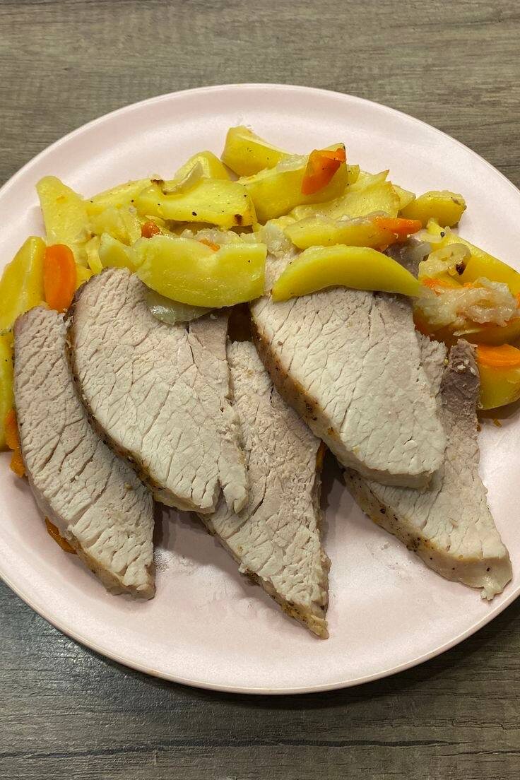 ◦ В форму для запекания выложите слой картофеля, сверху разместите лук, а затем положите подготовленный окорок. Можно добавить помидоры черри для дополнительного вкуса.