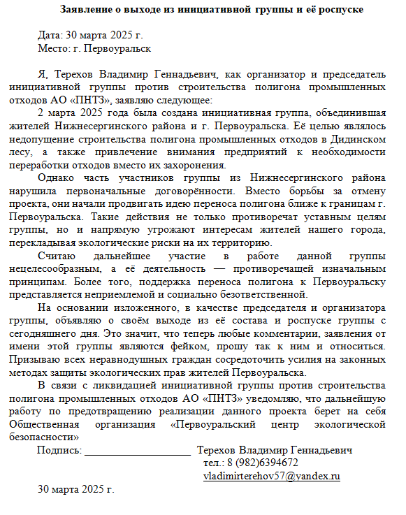 Сегодня, 30.03.2025, внезапно появилась информация о том, что председатель инициативной группы, В.Г. Терехов, в одностороннем порядке вышел из группы и одновременно объявил о роспуске инициативной группы.