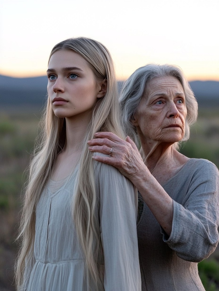 Создано на основе запроса: A beautiful young woman in her thirties, with long blonde hair and blue eyes, wearing light-colored , stands behind an older mother of the same era, dressed in gray, who has gray streaks on her temples. This is a cinematic scene from an A24 horror movie. The hand is stretched out to touch each other's shoulder, in a mountain field at sunrise in summer.
