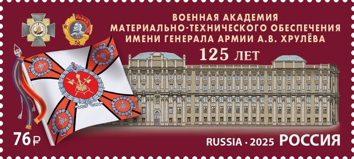 В Военной академии материально-технического обеспечения имени генерала армии А.В. Хрулёва прошла церемония гашения юбилейной марки. Об этом сообщает пресс-служба «Почты России». На марке номиналом 76 рублей, выпущенной тиражом 56 тысяч экземпляров, изображено здание академии, ордена Кутузова и Ленина, которыми отмечена академия за заслуги в обеспечении безопасности государства, укреплении обороноспособности и подготовке высококвалифицированных военных кадров,а также боевое знамя академии. «Самые значимые события в истории нашей страны и города находят отражение в продукции, которую почта традиционно выпускает к знаменательным датам. Уверен, что марка, посвященная 125-летию Военной академии материально-технического обеспечения и погашенная специальным штемпелем, пополнит коллекции филателистов», – сказал директор макрорегиона Северо-Запад «Почты России» Александр Вакуленко. Марки уже поступили в почтовые отделения Санкт-Петербурга и Ленинградской области. Ранее сообщалось, что Военная а