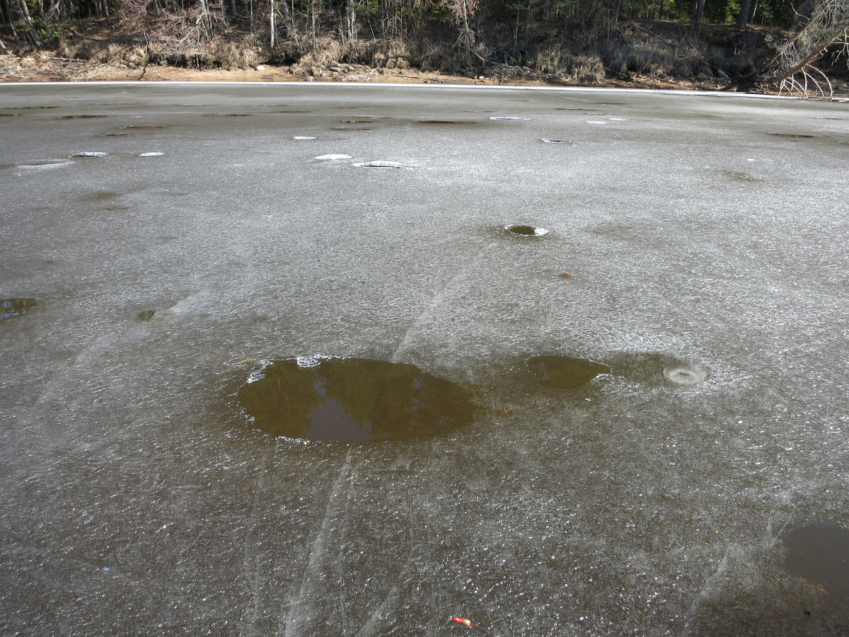 Вот уж попал на самый последний лёд. Многие места уже были и недоступны. За неделю перемещений по доступным местам, так достойной плотвы и не нашёл. В одном месте нашёл некрупную густеру, в другом -некрупную плотву. В пятницу вечером позвонил сосед-рыбачок. Его знакомые нашли таки (с камерой) место с хорошей рыбой. Два дня душили подлещика(200-800гр.) и леща(до 2.0кг.). Уносили со льда по пять пакетов! На третий день, в субботу, я им сел "на хвоста". На лёд уже выходили с трудом. Вчерашние их лунки были уже в зоне недосягаемости. Их уже здорово размыло, да и лёд уже был совсем никакой. Ловили где было можно и то, что можно. А ловить можно было всё того же подлещика( по ихнему тарабару), лещей я ни у кого в тот день не видел. Да и из их разговора, не очень то он (местный рыбачок, который сидел возле меня), и хотел. "Сам рад не будешь, когда он клюнет"( лещ от 2.0кг.). Учитывая , что у них про запас с собой по 2-3 мормышки, а в лунку 130‐150 он не влезет, багорики они не возят( а може