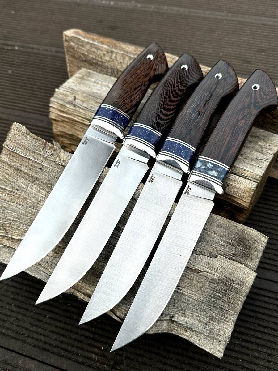 В свободной продаже рабочий универсальный нож «Засапожный» из отечественной нержавеющей стали 95х18. Сталь прочная на излом и долго держит заточку. Идеальный вариант для работы на кухне, охоте и рыбалке. Рукоять на ножах выполнена из акрила синего и африканского дерева венге. Благодаря синему цвету акрила, нож легко будет найти на в траве или снегу. Ножи заточены в бритву. Твердость каждого клинка (HRC): 58 Цена за нож: 8.760 рублей, со скидкой: 7.072 рубля. В комплекте идут ножны из натуральной кожи. Можем сделать формованные ножны +8000 рублей. Арт: 12673 Для заказа писать на @Nazarklinokbot или по тел +79101343831 WhatsApp/Viber