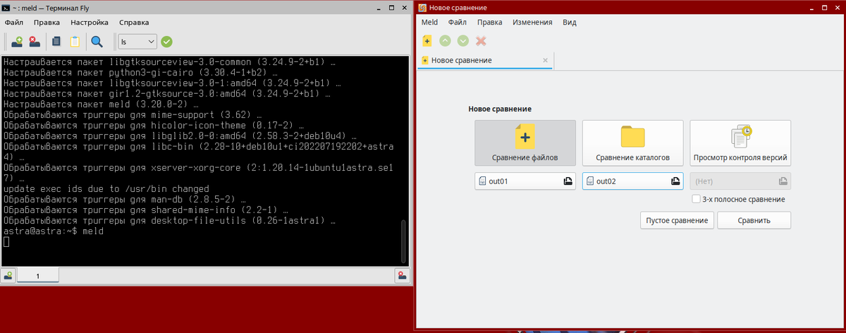 String20 ~$ sudo apt install meld ~$ sudo apt install diffuse ~$ diff -u out01 out02 > changes.patch теперь как применить изменения out02 к out01 ~$ diff -u out01 out02 > changes.patch (напомню в файле out01 все строки, в out02 только с четными номерами) --- /home/astra/out01 +++ /home/astra/out02 @@ -1,20 +1,10 @@ -String1 String2 -String3 String4 ........ -String17 String18 -String19 String20 Применим утилиту patch, изменим первый файл ко второму: