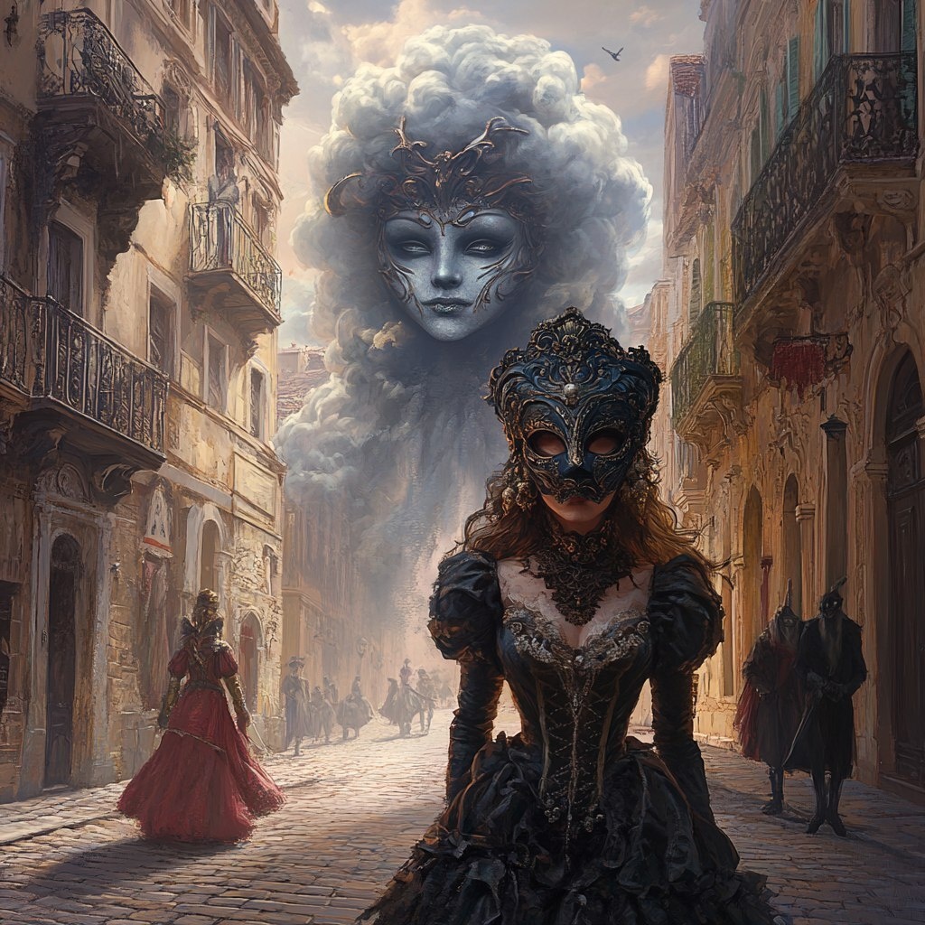 Создано на основе запроса: a surly teenaged vampress walking down a cobblestone street in 17th century Europe. She has a large ornate decorative mask hanging from her neck. Behind her looms a cloud giant woman.