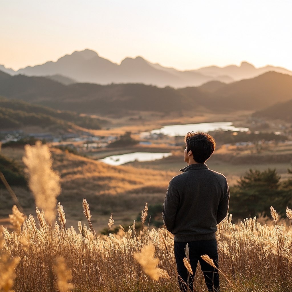 Создано на основе запроса: A Korean man in his 20s in a picturesque scene with a beautiful landscape