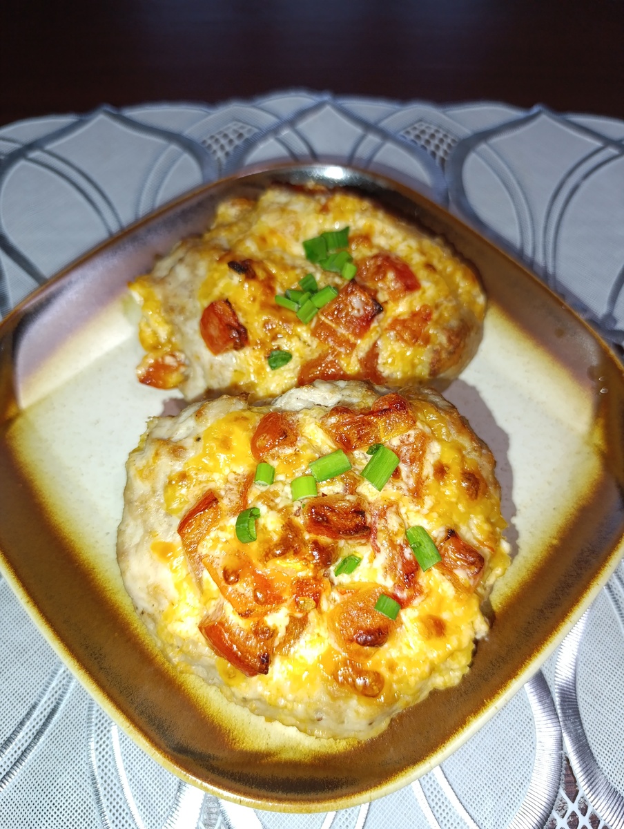 Ингредиенты: фарш - 1 кг помидоры - 3 большие шт сыр - 250 гр соль, перец, паприка, гранулированный чеснок по 1 ст л майонез - 100 гр Я взяла 1 кг фарша, так как половину котлеток буду замораживать. Вы можете уменьшить его количество, и, соответственно, количество всех остальных ингредиентов. Фарш смешиваем со специями и солью. Помидоры мелко нарезаем, сыр трем на терке и перемешиваем с майонезом. В противень выкладываю сформированные мокрыми руками котлетки и делаю в середине небольшие углубления. Противень не смазываю маслом, так как от фарша будет жир. В серединку, в углубления, выкладываю смесь помидоров и сыра. Выпекаем при 160 градусах 45 минут. Приятного аппетита!!!! Заморозка. При приготовлении полуфабрикатов котлеток под шубкой выкладываем их не на противень, а на деревянную или пластиковую доску, обмотанную пищевой пленкой. В таком виде ставим на 2 часа в холодильник для охлаждения (это нужно еще и для того, чтобы не было льда на полуфабрикате), а затем до следующего утра п