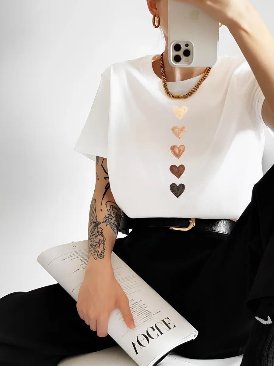 Стильная футболка с сердечками - отличная альтернатива привычной однотонной базе. Футболка свободного покроя, прекрасно смотрится как заправленная, так и навыпуск.