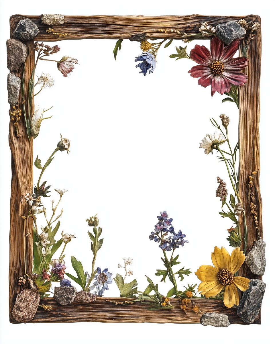 Создано на основе запроса: Medieval wild flower decorative wood frame with stone elements and engraving, white background