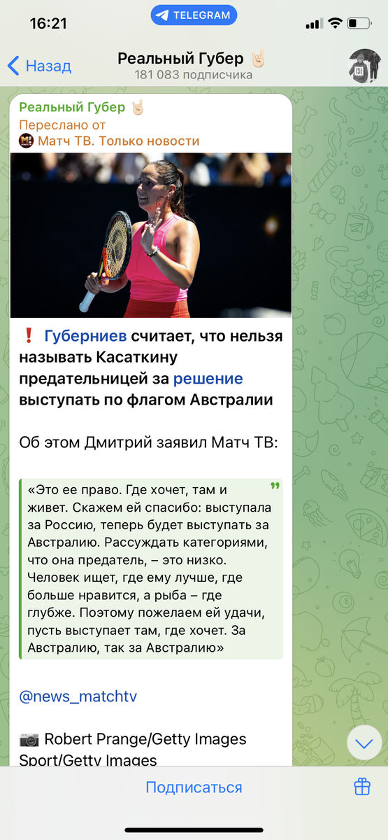 Посмотрев скрины очень дурно, на мой взгляд, пахнущей публикации Дмитрия Губерниева про «квасных патриотов» и про «новую родину» теннисистки Дарьи Касаткиной, я для начала решила убедиться в том, что губерниевские публикации до сих пор присутствуют в его ТГ-канале.