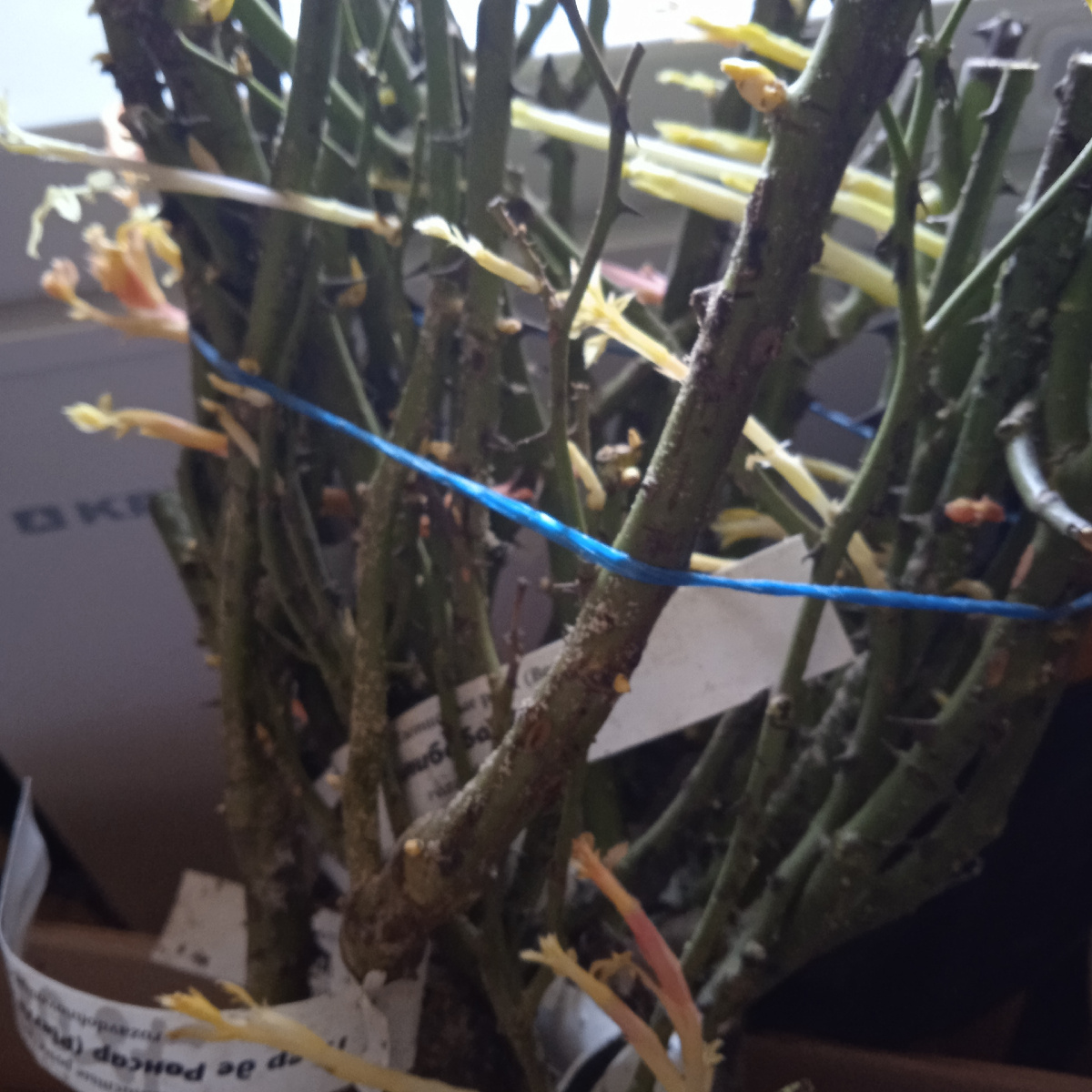 Обещала вчера рассказать, но не получилось, гости. Да и рассказывать было нечего. С утра дед сходил на почту и получил посылку с розами. Оказалась из питомника "Розы вдохновения" хотя я ожидала другую. Заказывала у них впервые. Уже после всего этого ажиотажа с открытием, зашла и спокойно заказала. Вот в таком виде розы пришли. Впервые получаю розы так связаны. Обычно каждый кустик упакован отдельно. Но и с такими корнями тоже вперые. Может это старые кусты? Когда освободила от упаковки, там мощные корни и уже беленькие наросли. Ну не буду же я их раздирать, поэтому на сутки замочила в ведре с водой. Грунт хорошо отошел, освободив корни. Ну и чтобы они у меня не зацвели в котельной, сегодня после кухни и готовки, принялась за посадку. Вчера возилась с ямками для них. Какие уже полностью приготовила, а какие просто наметила где буду сажать. Думаю, может желающие найдутся помочь. Дело- то тяжелое! Роз всего в посылке было 8, осилила только 6. Это еще дед воды приносил из дома.. Их же на