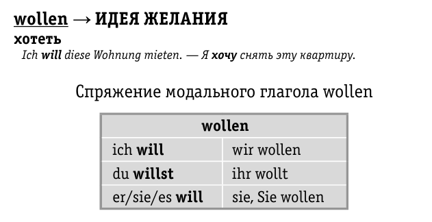Wollen, как и все модальные глаголы имеет следующие особенности: 1. В единственном числе меняется корневая гласная: o на i. 2. Формы глагола для местоимений ich, er, sie, es не имеют личных окончаний и совпадают. Чтобы запомнить все формы этого глагола в настоящем времени (в Präsens) выполним следующие упражнения: Упражнение 1 Впишите в таблицу глагольные формы. Упражнение 2 Соедините местоимение и соответствующую ему глагольную форму. Упражнение 3 Необходимо выбрать подходящую форму из 3-х предложенных После выполнения каждого задания сделайте скриншот (фото) ответа и прикрепите его в комментариях!