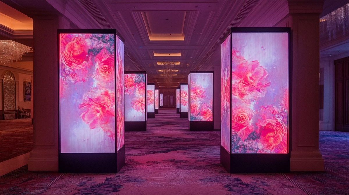 Автоперевод: Один четыре светодиодных экрана, расположенных в квадратной форме коробки, заставляя его выглядеть так, как будто в стиле Ван Гога есть цветущий цветок, в центре коридора для события для женского дня, легкое розоватое настроение,
