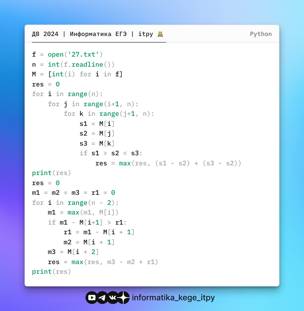 Пусть S - последовательность из N целых чисел, пронумерованных подряд, начиная с 1. Обозначим S_i,S_j, S_k как три элемента последовательности S, где і < j < k. Определите в последовательности S три таких члена S_i, S_j, S_k, что S_i > S_j, S_k > S_j и значение выражения (S_i -S_i) + (S_k-S_j) максимально.