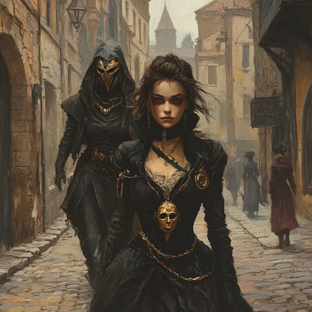 Создано на основе запроса: a surly teenaged vampress walking down a cobblestone street in 17th century Europe. She has an ornate decorative mask hanging from a chain around her neck. Behind her looms a female giant protectively. --- Автоперевод: Супер -подростковый Vampress, идущий по улице булыжника в Европе 17 -го века. Как тебе такое изображение? 🤔 https://dzen.ru/id/65c0c65c86e4f837c27b24d7 #ИИ #AI #нейросеть #midjourney #art