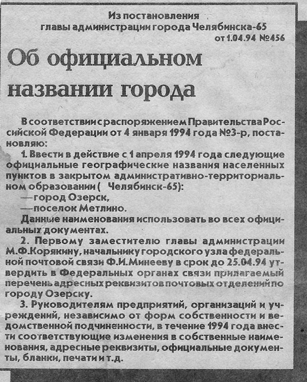В соответствии с распоряжением Правительства РФ от 04.01.1994 № 3-р главой администрации города Челябинска-65 А.Н. Подольским 1 апреля 1994 года издано постановление о введении в действие официального названия населенного пункта - вместо в г. Челябинск-65 город Озерск (такое же как было дано наименование городу ещё 17 марта 1954 года)