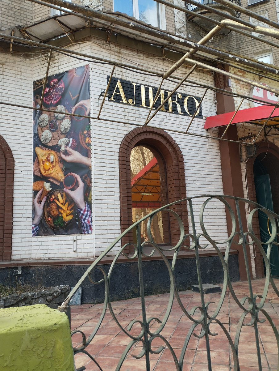 Любопытно, почему сегодня стала настолько популярна грузинская кухня? Почему практически во всех крупных городах Большой России можно найти заведения, где в меню немалый выбор ее самых известных блюд? К слову, в некоторых умудряются их просто безнадежно испортить. Именно с таким неприятным фактом столкнуться пару лет назад: Но больше примеров положительных. К примеру, в Ростове-на-Дону, где, как и в других российских городах работают сетевые кафе Старик Хинкалыч: В Донецке, разумеется, таких нет. Но грузинская кухня также очень популярна. Даже там, где в меню блюда русской: И вот совсем недавно открылся новый ресторан грузинской кухни, как значится на вывеске. А на выносном штендере несколько иначе. Концепция, конечно, своеобразная. Почему здесь решили объединить Грузию и Италию, мне поначалу было непонятно. А потом подсказали, что раньше на этом месте был итальянский ресторан. Да, и так бывает в Донецке. В зале столиков немало. Есть такой в уголке окошка. Есть другие там, где светло