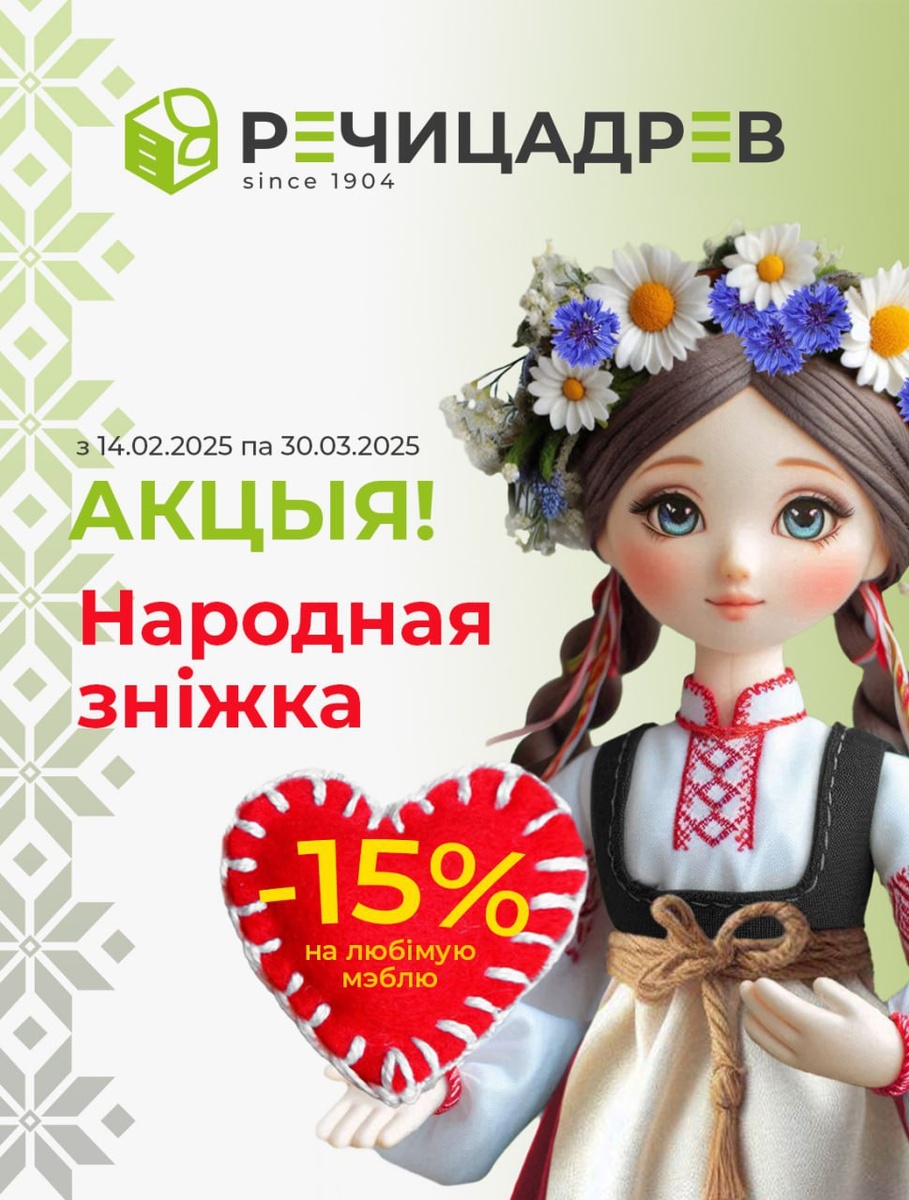 Акция "Народная Знiжка"!🇧🇾 -15% на полюбившиеся наборы мебели!!! ✨☀️🔥 Приглашаем за белорусской продукцией по выгодным ценам! ☀️ Срок проведения акции: с 14.02.2025 по 30.03.2025 🕛 Акция действует во всех фирменных магазинах "Мебель Речицадрев"!!! Подробности акции уточняйте у продавцов-консультантов 💁♀ ✅ Действуют карты рассрочек! ✅ Фирменная рассрочка до 18 месяцев без процентов и переплат! ✅ Кредит "На родныя тавары" под 4% до 3-х лет! * Цвет изделия может отличаться от представленного цвета на фото Официальный партнер мероприятий, посвященных 80-летию Победы