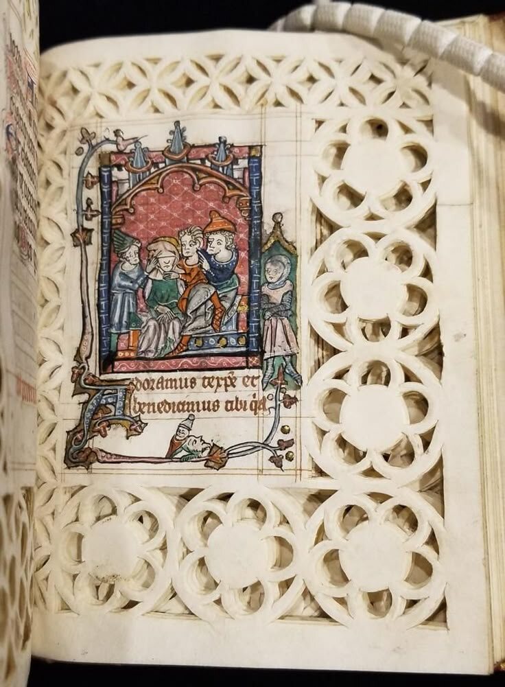 Как-то мне довелось реставрировать уникальную картину, изображающую «Погребение Христа» и созданную на бумаге необычным методом прорезания и давления. Отсылаю тех, кто заинтересовался историей реставрации редкого объекта, к своей статье в ЖЖ – «Тайна бумажного кружева» Техника создания изображения путем его вырезания на пергаменте или бумаге известна в Европе с XV в., и, как многие другие искусства и ремесла, пришла из Китая. В XVI в. технику резьбы начали применять достаточно широко. Сохранилось семь книг, выполненных подобным способом – так называемые «нематериальные» книги (Immateriellen Bucher) или «кружевные» Библии, появившиеся на рубеже XVI – XVII в., в которых вырезаны (прорезаны насквозь) и текст, и заставки, и иллюстрации. Старейшая из них находится в Бельгии, ее название в переводе с латыни звучит следующим образом: «Книга Страстей Господа нашего Иисуса Христа ... составленная не из реальной материи». Это 24 белых «кружевных» страницы размером 14,5 х 9,5 см с подложками из