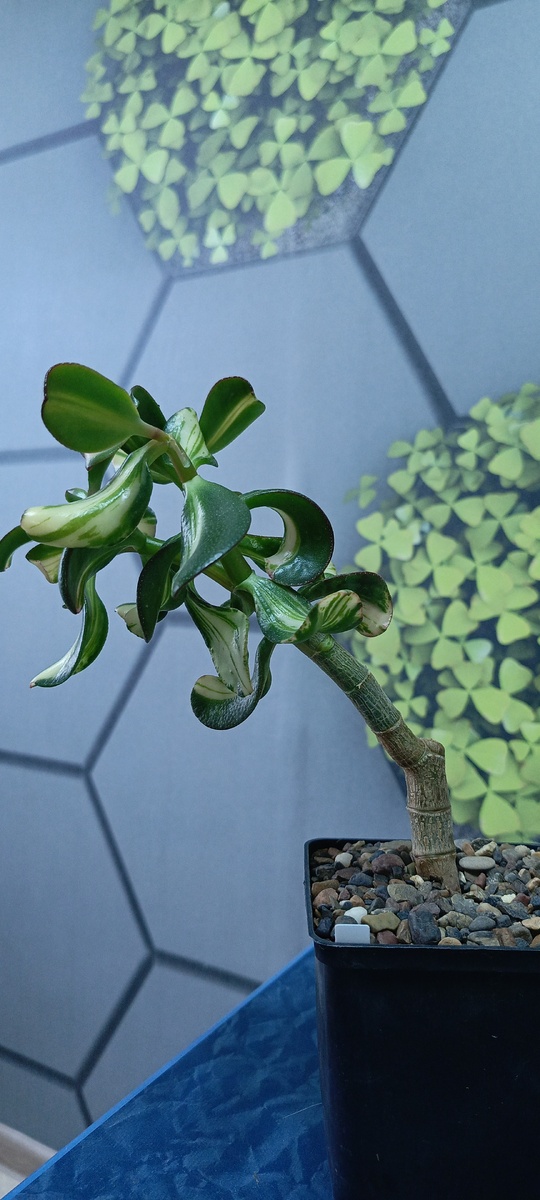 Здравствуйте друзья. Сегодня перебирал, коллекцию древовидных крассул и нашел интересный экземпляр Crassula Return of Beauty. Летом 2024 года этот обрезал растение(на фото видно следы обрезки), так как гнал не сортовой а полностью зеленую ветку.За время прошедшее до весны 25 года растение сильно наклонилось, так как подпорки использовать не хочется, так как считаю что дерево нужно обрезать, что бы оно самостоятельно держало форму. Сегодня решил взяться за обрезку. Ножницы обработал спиртовым раствором, что бы не занести инфекцию. Обрезал на нужной мне высоте. Отрезанный черенок посадил в лечузу пон(когда не не было лечузы, использовал перлит). Смотрел многих блогеров, которые советуют сушить перед посадкой. Как лучше конечно не спору. Но при посадке в сухой субстрат, всегда отличный результат. Главное помнить что субстрат должен быть абсолютно сухой, и первый полив проводить минимум через две недели и немного.И не ставим на палящее солнце, лучше в полутень.В моих условиях оно б