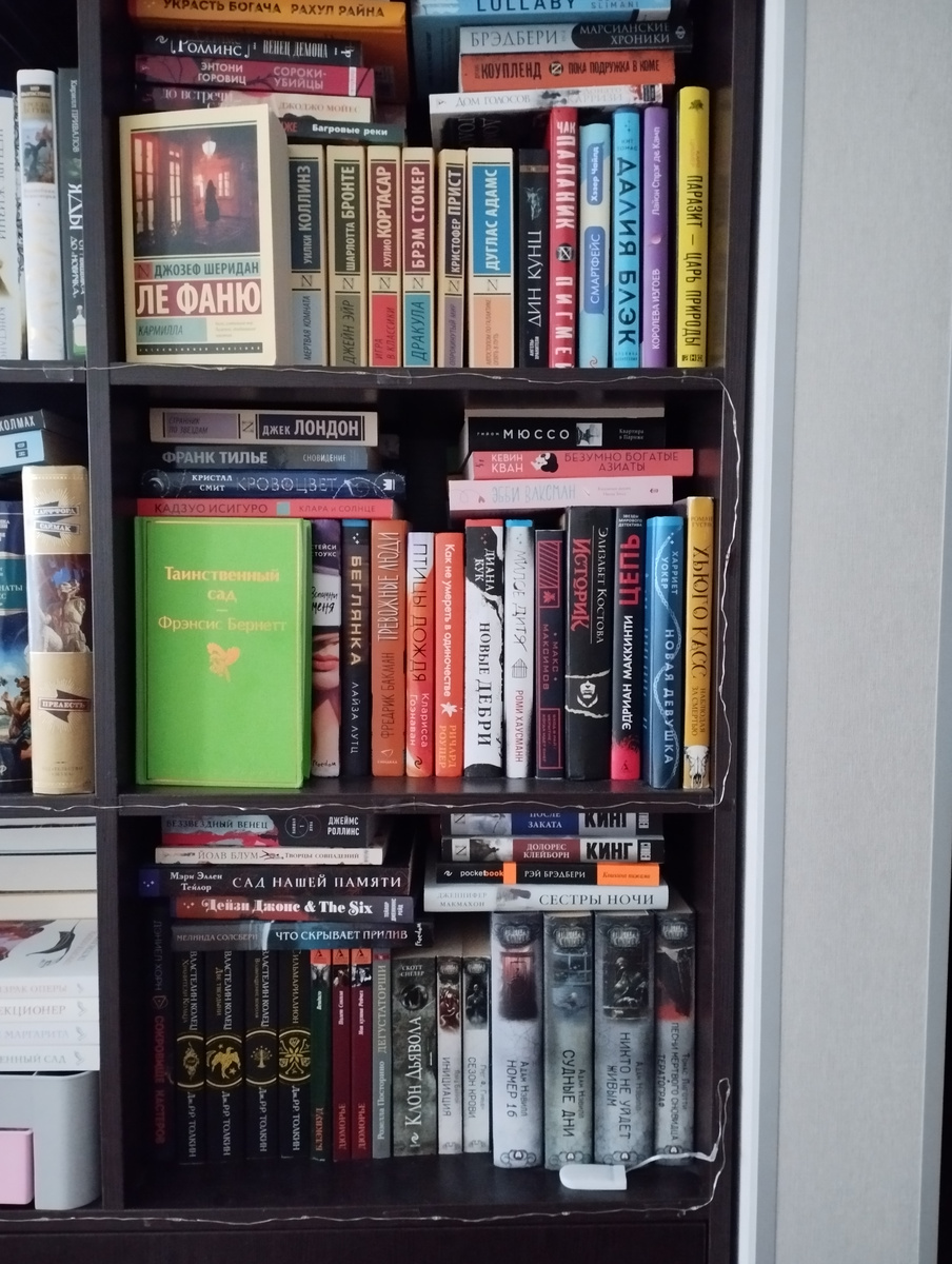 Что ж, пришло время традиционного перетряхивания книг. Раз в год (да, в предыдущей подобной статье (ссылка в конце) я говорила, что делаю это раз в полгода, но оказалось, что это не так 😅) перебираю их, откладываю лишние, а оставшиеся ставлю обратно в другом порядке, чтобы глаз радовало. Где-то на стадии доставания с полок надо еще обязательно поужасаться количеству книг. 😅 Прошлогоднюю перестановку я почему-то не показывала, но, с другой стороны, там и не так много новых книг было. Ладно, приступим! Начнем, конечно же, с изначального вида полок. На них появилась подсветка... и кончилось место. 🤣 На виду у меня стояли в основном непрочитанные книги, кроме Толкина (черные книги с желтыми кружками на самой нижней полке) и серии "Эксклюзивная классика". Сейчас же прочитанных среди них прибавилось, так что пора убрать что-нибудь назад... А эта стопка вообще на полу стояла. Здесь несколько новых книжек от "Белой птицы" и старые, которые у меня брали напрокат. Кстати, "Таинственный сад"