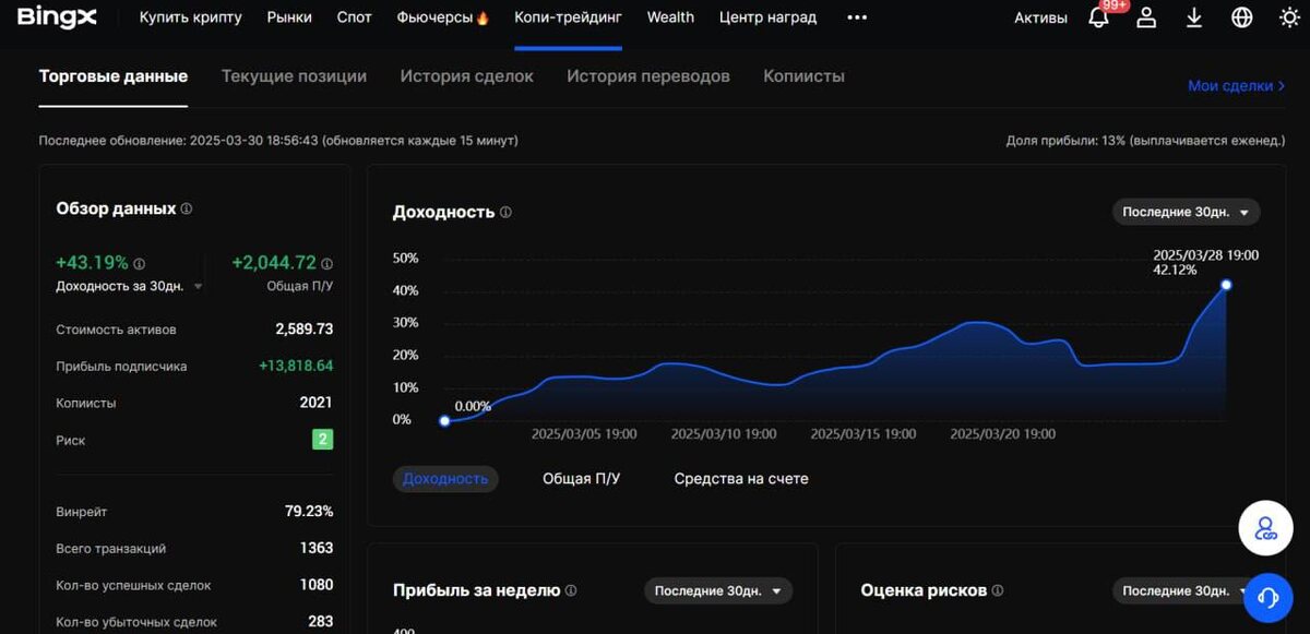 +43.19% за 30 дней. 2 000+ копирующих. 13 818 USDT прибыли подписчикам. Ты всё ещё не в деле? Серьёзно? Пока ты листал мемы и искал “точку входа”, здесь люди зарабатывали, не касаясь клавы. Просто нажали "копировать" — и получили деньги на баланс. 79.23% винрейт Более 1 000 успешных сделок Риск-профиль: 2 из 5 — я не играю в казино. Я строю систему. А ты можешь дальше доказывать в чатах, что “трейдинг — это скам”. Но график — не врёт. А кошелёк тем более.