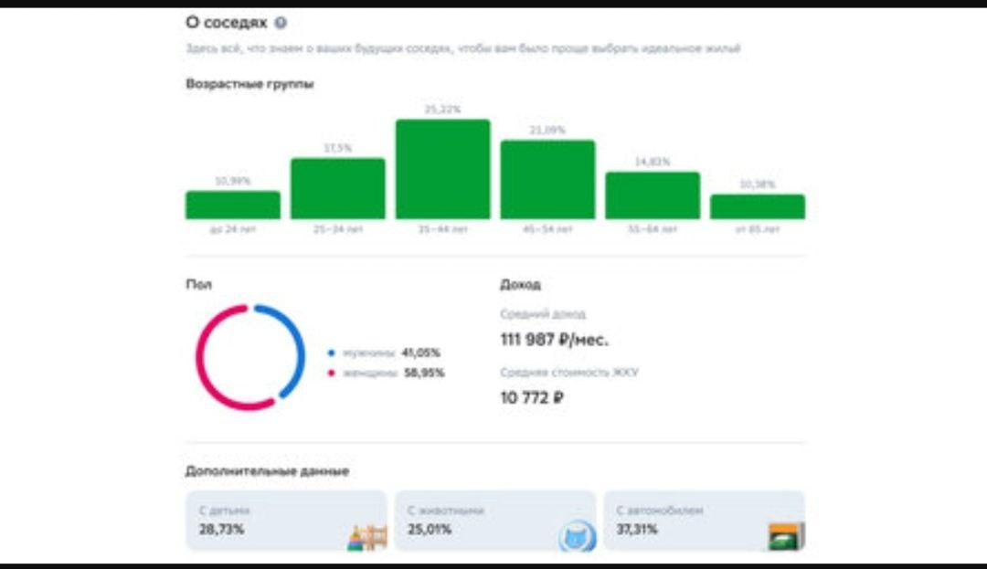 Сбербанк раскрыл покупателям «вторички» данные о соседях Теперь перед покупкой квартиры на вторичном рынке клиенты могут узнать многое о своих будущих соседях: есть ли дети и животные, сколько машин, социальный срез — средний доход, возраст, пол, платежи по коммуналке. Очень полезно, чтобы примерно представлять, с кем рядом будешь жить и сколько собак будет лаять на лестничной клетке. Информацией с «Домкликом» поделилась СберАналитика на основе данных клиентов Сбербанка.