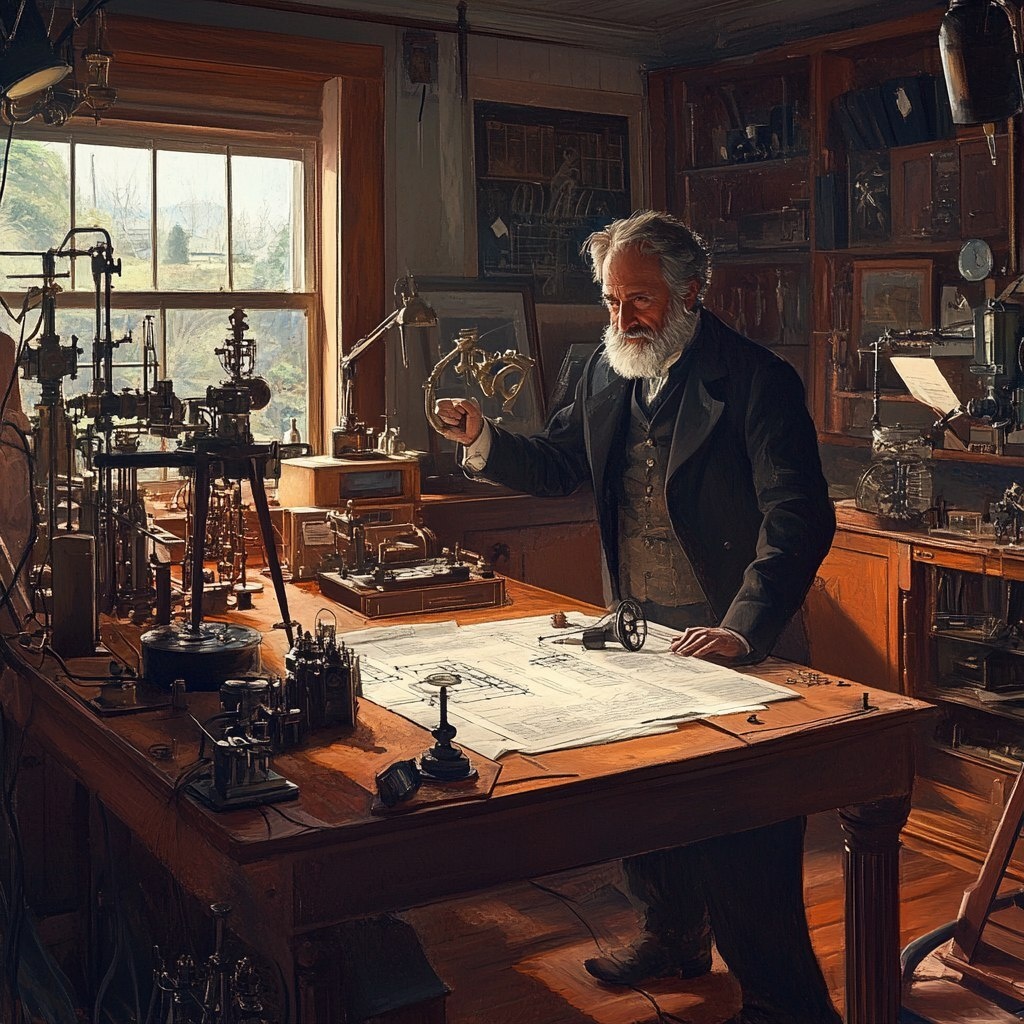 Создано на основе запроса: A historical scene in 1876, Alexander Graham Bell in his workshop, excitedly working on the first telephone prototype. The room is filled with old scientific equipment, wooden furniture, and blueprints scattered around. Warm lighting, a sense of discovery and innovation. --- Автоперевод: Историческая сцена в 1876 году, Александр Грэм Белл в своей мастерской, взволнованно работая над первым телефонным прототипом. Классно вышло? 🤔 https://dzen.ru/id/65c0c65c86e4f837c27b24d7 #ИИ #AI #нейросеть #midjourney #art