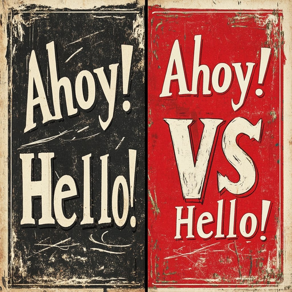 Создано на основе запроса: A dramatic split-screen image, "Ahoy!" on one side and "Hello!" on the other, styled like a vintage newspaper