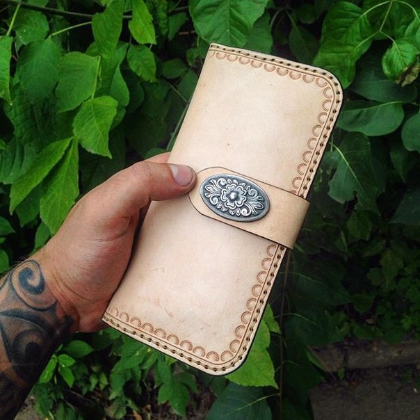 На фото вы видите портмоне ручной работы, выполненное из светлой бежевой кожи с изящным цветочным узором на застёжке. Светлый оттенок кожи придаёт изделию мягкость и утончённость, а декоративная застёжка с цветочным орнаментом добавляет нотку винтажного шарма. Края портмоне украшены фигурной строчкой в виде полукругов, что подчёркивает мастерство ручной работы. Ручная работа видна в каждой детали: от аккуратной строчки до гладкой текстуры кожи.