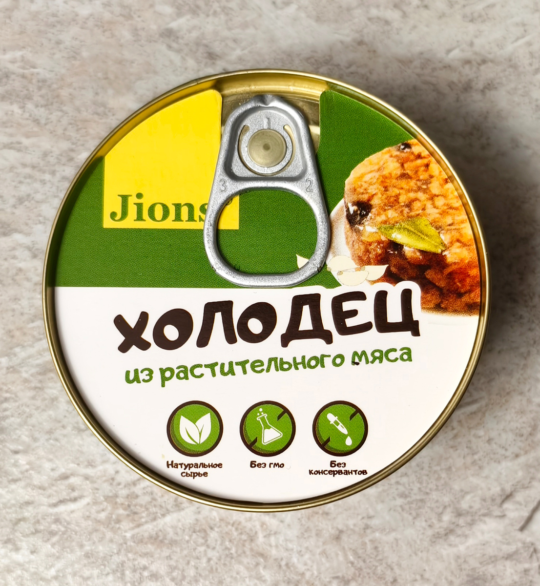 Всем привет! В честь Великого поста по традиции пробую какой-нибудь веганский продукт. Я уже пробовал гороховые сосиски и картофельную колбасу, а сегодня у меня на столе достаточно интересный продукт. Холодец из растительного мяса. Звучит дико конечно. Вот такая маленькая баночка 105 граммов обошлась в 250 рублей. Быть веганом в наше время это очень дорого как по мне. Состав отличный. Текстурированный растительный белок, кокосовое масло, гидролизиоованный кукурузный белок, дрожжевой экстракт, соль морская, лавровый лист, перец душистый, экстракт чеснока, агар-агар, каррагинан. Что ещё нужно для веганского счастья? Изготовитель: ООО "Веган Лайф", г. Ижевск. Похоже ли это на холодец? Ну, наверное, да. Желе есть, внутри что-то похожее на мясо есть. Пахнет не противно. Даже огромный душистый перец есть как на картинке. Могли бы и размолотить его. В общем на вкус этот холодец как пересолёная гречневая каша. Не знаю почему, но мои вкусовые рецепторы почувствовали именно этот вкус. А в