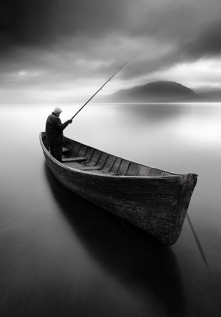 Автоперевод: Черно -белая фотография силуэта старого шотландского рыбака, держащего рыбацку на старой рыбацкой плоской лодке, в стиле минимализма с пейзажами с темно -серыми и легкими бронзовыми тонами, напоминающими Карла Кляйнера, Энди Кехо и Айвазовский, с чувством движения и отражения.