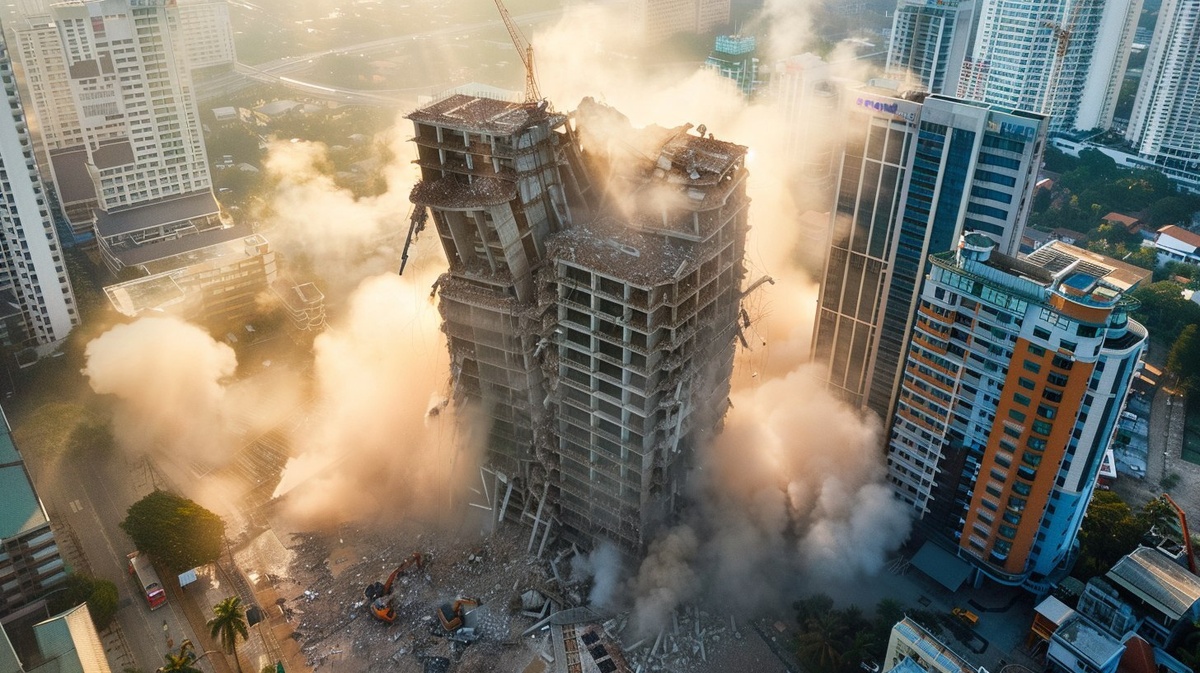 Создано на основе запроса: an aerial photo of an under constrution high rise building collapsing moment in the afternoon sunny day at