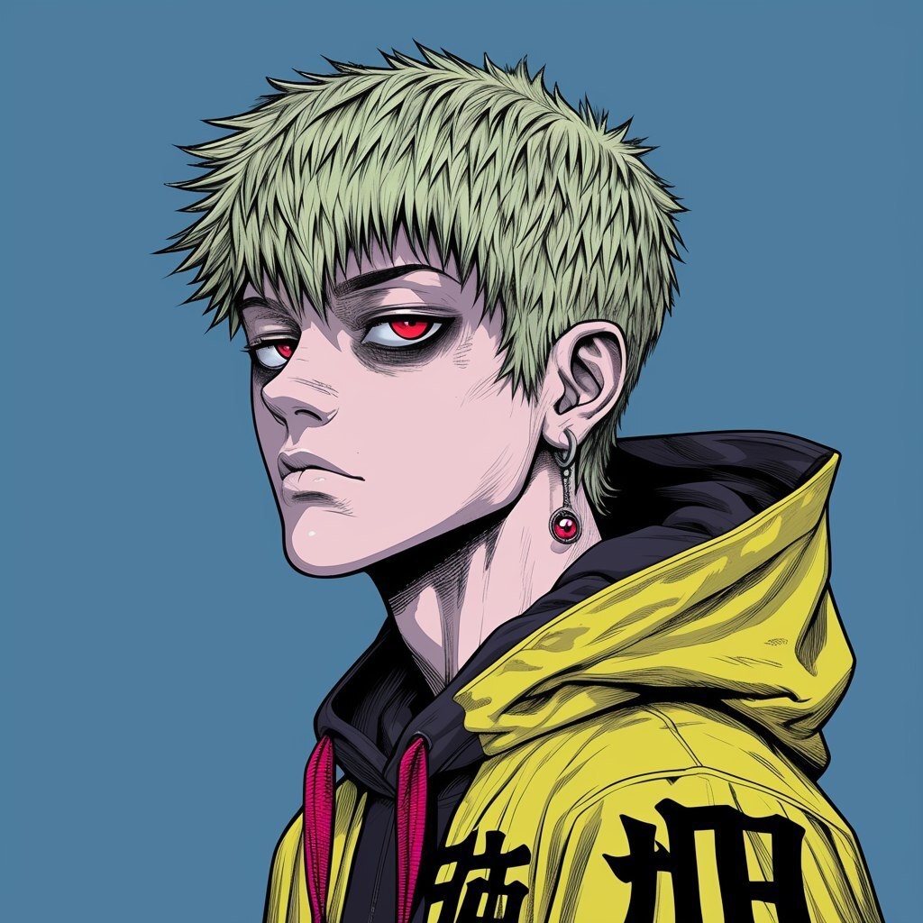 Создано на основе запроса: A realistic side profile portrait of a boy in a manga 2d style, cel-shading, flat design, extreme contrast, simple shapes and lines, wearing a neon green hoodie with deep purple accents, short spiky blonde hair, slender red eyes, natural warm beige skin tone, dramatic lighting, strong cel-shading on face, solid bright cyan background, ultra-detailed ink lines --- Автоперевод: Реалистичный портрет с боковым профилем мальчика в стиле манги 2D, сценаринг, плоский дизайн, экстремальный контраст, простые формы и линии, одетый в неоново-зеленую толсту Хорошо вышло? 🤔 https://dzen.ru/id/65c0c65c86e4f837c27b24d7 #ИИ #AI #нейросеть #midjourney #art