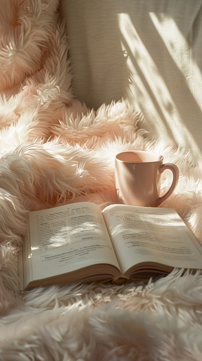 Создано на основе запроса: cozy setup with pink coffee mug and open book on fluffy blanket, soft shadows, morning sun, Leica M10
