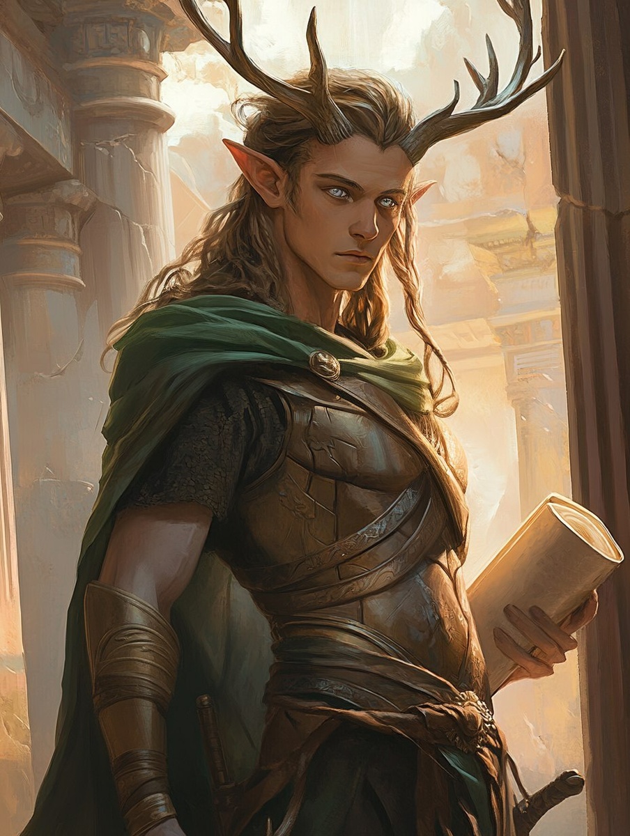 Создано на основе запроса: Ancient Greek male elf Emissary with antlers on his head with light brown long hair