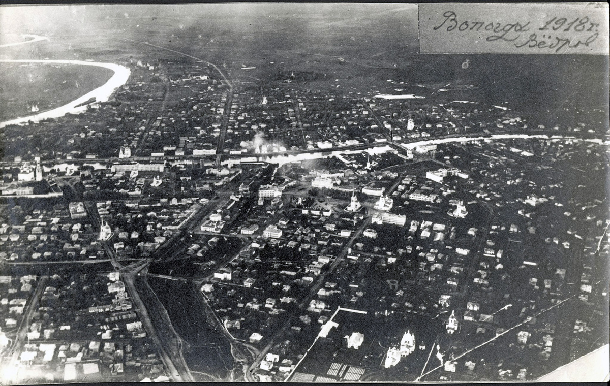 Снимок Вологды с высоты птичьего полёта, сделанный в 1918 году, используем в качестве точки опоры для продолжения вчерашней темы про вологодские «авиашоу» в начале ХХ века.