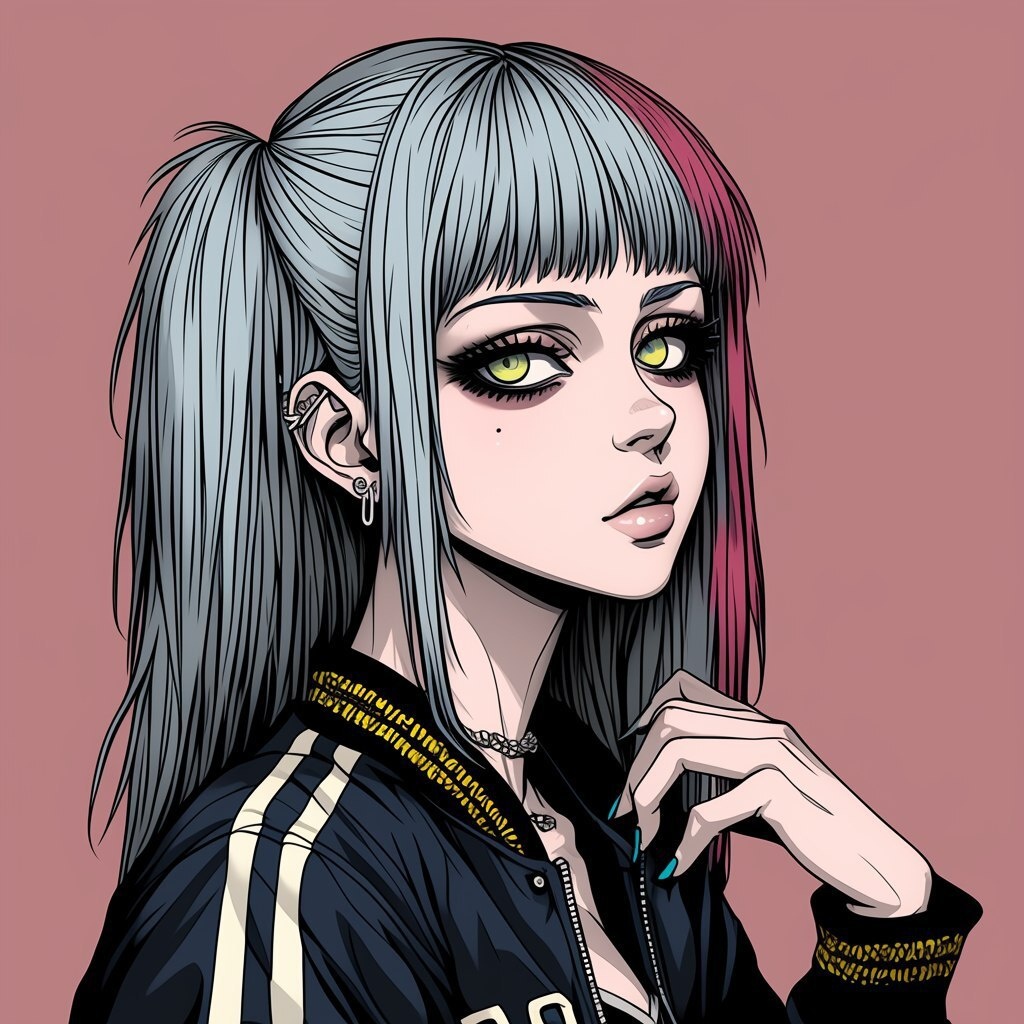 Создано на основе запроса: Side profile portrait of a woman an anime style, Junji Ito horror manga influence, cel-shading, flat design, high contrast, simple shapes and lines, wearing a cropped deep blue varsity jacket with golden details, wavy lavender hair with neon blue streaks, piercing emerald green eyes, solid warm peach background, ultra-detailed ink lines, 8K --- Автоперевод: Портрет бокового профиля женщины-аниме-стиль, влияние манги ужасов Джунджи Ито, разжечь хелс, плоский дизайн, высокий контраст, простые формы и линии, в укороченной темно-синей обменной куртке с золотистыми деталями, волнистыми лавандовыми волосами с неоновыми полосами, пирсинговые зеленые глаза, сплошные персиковые фоны, ультра-хрупкие линии чернила, 8 тык Классно вышло? 🤔 https://dzen.ru/id/65c0c65c86e4f837c27b24d7 #ИИ #AI #нейросеть #midjourney #art
