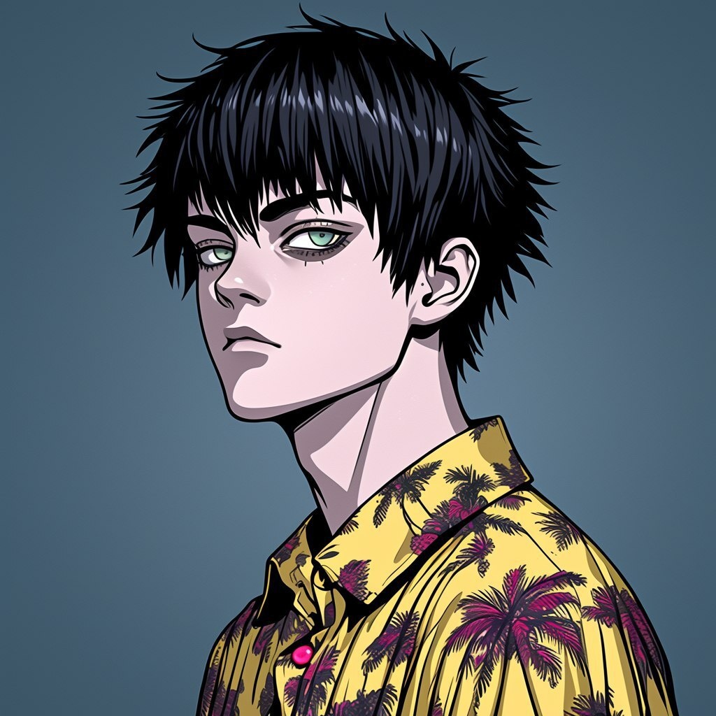 Создано на основе запроса: A realistic side profile portrait of a boy in an anime style, cel-shading, flat design, extreme contrast, simple shapes and lines, wearing a bright yellow Hawaiian shirt with deep purple palm patterns, short messy dark auburn hair, slender emerald green eyes, natural warm beige skin tone, dramatic lighting, strong cel-shading on face, solid deep teal background, ultra-detailed ink lines, 8K